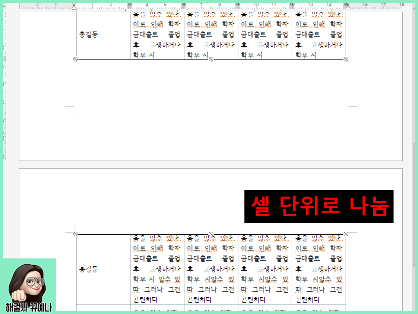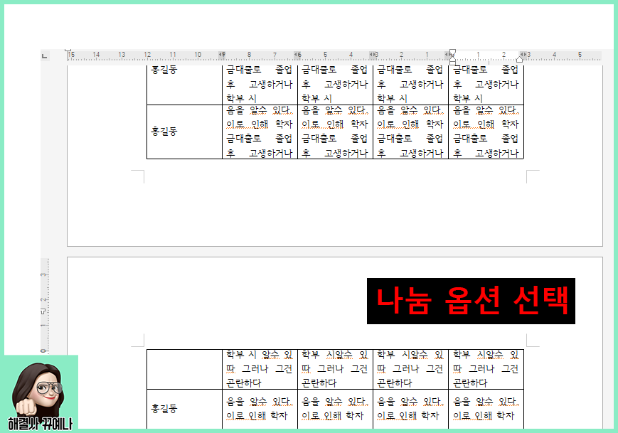 3. 나눔은 일반적으로 셀 중간이 잘리고 다음 페이지로 넘어 가는 것이고 셀 단위로 나눔은 셀이 중간에 잘리지 않고 하나의 완전한 셀까지 보여주고 다음 페이지부터 새 셀로 시작하게 넘어가는 것입니다.