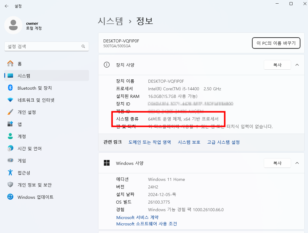 3. [시스템 종류] 항목에서 32비트인지, 64비트인지 확인!