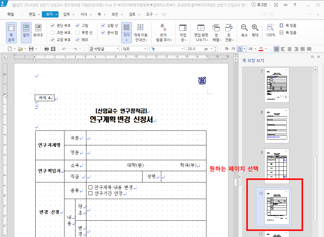 먼저, 작업하고 싶은 한글 파일을 열고 상단 메뉴에서 보기 > 작업창을 선택하세요. 그다음 쪽 모양 보기를 클릭하면 문서의 페이지들이 썸네일처럼 표시됩니다.