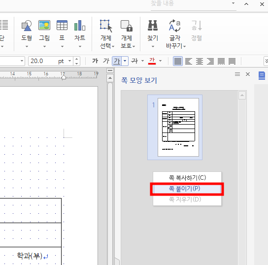 새 문서를 열어, 쪽모양 보기에서 우클릭- 쪽붙이기를 선택하세요. 이제 필요한 페이지만 새 문서에 담겼습니다!