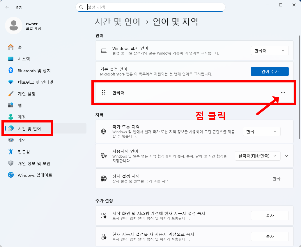 2. 한국어(대한민국) 옆의 점 세 개(⋯) 클릭